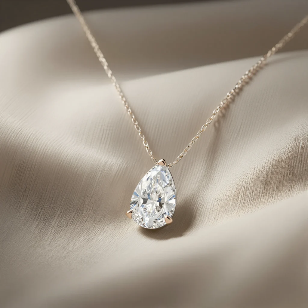 Amiyah – flowing chain of 14K gold weighing 2.39 grams, set with a drop-cut CVD laboratory diamond with an IGI certificate, E-F color and VVS-VS cleanliness. Its soft design is intended for a woman who lives in flow and natural beauty. Description: 14K gold jewelry, total weight of 2.15Gr.
